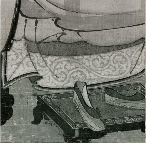 龙牙蕙草经常作为一种既时尚又讲究的符号出现在多种场域,特别是受到僧侣们的青睐,几乎成了排场。如日本滋贺县西教寺藏南宋13世纪宁波地区画家张思训绘天台宗大师智(538-597)像,座椅就悬披着满饰龙牙蕙草的布帛(图17);奈良东大寺藏室町期(1336-1573)画唐代高僧鉴真(688-763)像,坐榻后方围屏也是将之作为边饰(图18);相国寺藏室町期春屋妙葩像座椅上的龙牙蕙草铺饰(图19),可说是忠实承继了前引智像的格套装饰(见图17)。另外,陕西省扶风法门寺地宫所见伴出唐咸通十五年(874)《衣物帐》的鎏金伎乐纹银香宝子(图20),也是以龙牙蕙草来衬托鎏金乐人。