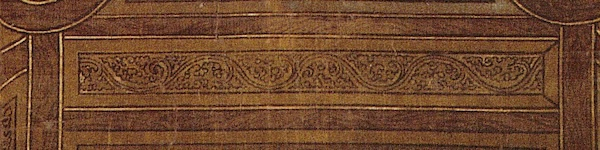 20世纪初英国人斯坦因(Aurel Stein)曾在罗布泊西部楼兰古国遗址采集到公元前后时期之饰有半棕叶唐草纹的木质建筑或家具构件(图36),而更往西的位于阿富汗首都喀布尔(Kabul)西北的巴米安(Bamian)石窟则可见到与“龙牙蕙草”有些许相似、无植物要素之呈涡卷状带双叶形瘤节的唐草纹,其被认为是半棕叶唐草激烈扭转的抽象变形(图37),相对年代约在6世纪,是融合了印度笈多王朝后期连续反转涡卷纹和希腊化罗马系波状唐草纹的产物,并且影响到7至8世纪时期的粟特艺术。
