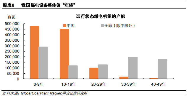 其次,我国煤电设备整体偏“年轻”。2020年,我国运行状态的煤电设备使用年限在10年以内的产能为475,805.5MW(占比46%),20年以内的产能为1,331,632.24MW(占比89%)。全球除中国外,20年以下的煤电设备产能占比仅为45%(图表8)。