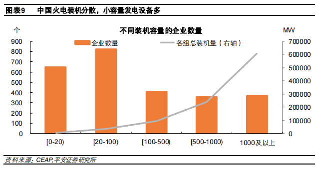 第三,火电装机分散。根据全国火电排放数据库(CEAP)数据,2017年我国使用火力发电设备的2597家企业中,有647家企业装机量不足20MW,1470家企业装机量不足100MW。可见,我国火电装机呈现分散化局面,发电产能置换涉及的领域更分散(图表9)。
