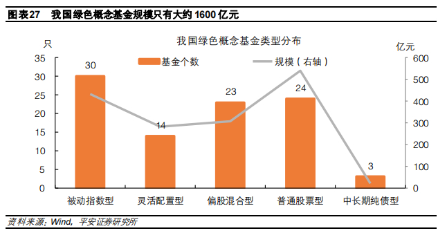 绿色基金方面:目前,社会各界将扶持绿色经济、绿色产业发展的基金统称为绿色基金,对于绿色基金的定义缺乏统一明确的共识。根据Wind数据统计,截至2021年4月底,在所有公开发行的基金中,基金名称中含有“绿色”、“可持续”、“低碳”等关键词的公募基金共计有94只,总规模为1580亿元(图表27)。相较于我国20万亿的公募基金规模,绿色基金规模仍然较小。另外,由于绿色标准界定统一的问题,我国绿色基金投资标的并未严格限定在环保行业。