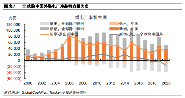 首先,我国煤电装机容量仍在增加。2020年,我国煤电厂产能新增量和退出量分别为38,390MW和8,628MW,新增量远大于退出量,净增加量为29,762MW。而全球除中国外已经达到负净增水平,净退出量为17,230MW(图表7)。因此,相较于全球其他国家,我国需要承担较高的高碳产能退出的搁浅成本。