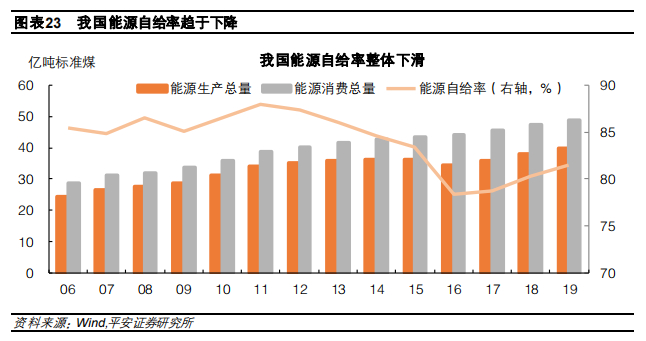此外,货币政策的绿色信贷激励需要平衡短期和长期利弊。在短期:一是,银行投资于绿色产业的风险收益情况存在一定的不确定性;二是,如果强制压减高碳领域信贷,可能造成高碳企业的违约问题。在长期:高碳企业经营情况恶化导致的产能不足,严重时可能导致能源安全问题。目前,我国能源自给率在80%以上,但已较前期水平有所下降(图表23)。