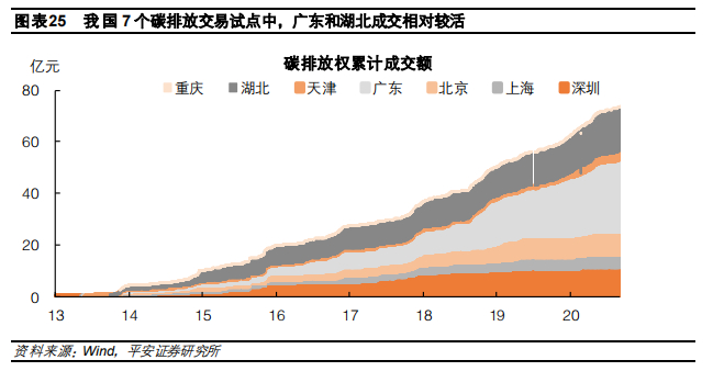 对标欧盟来看,欧盟碳排放交易体系(EU ETS)成立于2005年,其发展经历了4个阶段(2005-2007年、2008-2012年、2013-2020年、2021-2030年),前两个阶段的总量控制采用自下而上的方式(配额分配到各部门后加总),后两个阶段采用自上而下的方式(设定总额后分配),配额的分配从免费发放逐渐向拍卖转变(图表24)。