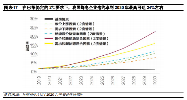 彭博新能源估计,随着新能源技术发展,可再生能源发电综合成本不断降低,2030年我国太阳能和风电等清洁型替代性能源的综合发电成本要比煤电发电成本低一半。再叠加监管部门可能提高棕色资产的风险权重,从而提高高碳企业的融资成本,高碳企业面临财务状况恶化、违约率提高的风险。2020年我国主要煤电企业的年度违约概率低于3%。但根据马骏和孙天印(2020)测算,在2℃情景要求下,由于需求下降、新能源发电成本持续下降带来的价格竞争加剧、融资成本上升,到2030年我国主要煤电企业违约概率将上升到24%左右(图表17)。若事实如此,将对我国金融体系的资产质量和稳定性构成威胁。