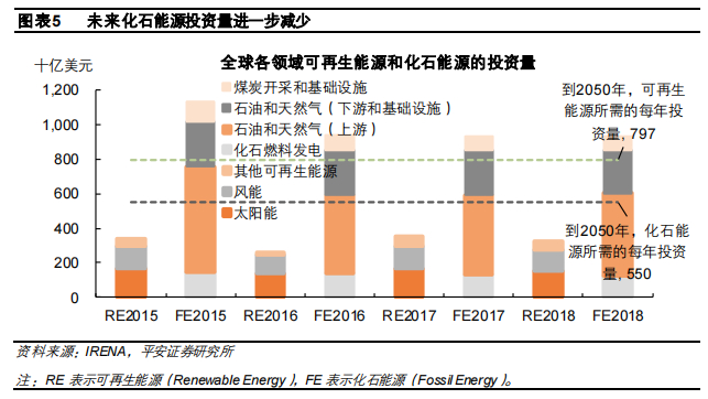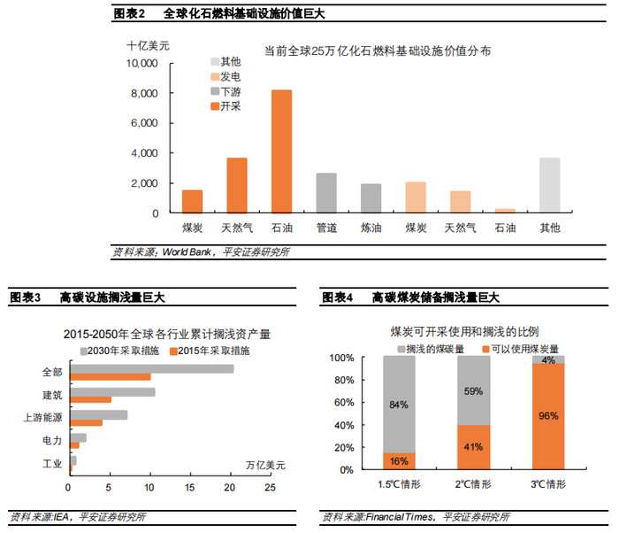能源领域拥有全球最大的建成资产基础设施,建设成本高达25万亿美元,包括开采(13.2万亿)、下游(4.5万亿)、发电(3.6万亿)和其他(3.6万亿)(图表2)。当可再生能源发电成本低于化石能源时,传统化石能源市场竞争力下降,关停化石燃料电厂即成合理行为。随着能源转型的不断推进,现有能源领域将出现大量潜在搁浅资产。根据国际能源署(IEA)和国际可再生能源署(IERNA)2017年的测算,当仅考虑转型对部分高耗能行业的影响时,若从2015年开始,走可再生能源代替化石能源的路线,那么2015-2050年全球将有10万亿美元的资产搁浅;若延迟采取行动的时间至2030年,将有20万亿美元的资产搁浅(图表3)。