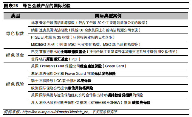 绿色金融产品创新任重道远,但有路可循,发达国家提供了丰富借鉴。例如,绿色基金、绿色保险等在欧美国家发展较早;国际绿色股票指数及强制 ESG信息披露制度已经是国际绿色股权投资中非常重要的两个部分;碳金融方面,欧美国家推出了碳期货、碳期权、碳远期、碳掉期等碳金融衍生交易品,以及碳基金和碳保险等碳金融工具及服务。