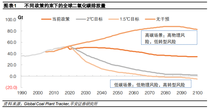 气候变化给金融系统带来两大风险,物理风险(Physical risks)和转型风险(Transition risks)。物理风险指异常天气事件损害企业、家庭、银行和保险公司的资产负债表,进而造成金融和经济不稳定;转型风险指经济体在向低碳经济转型过程中,气候政策等发生变化导致资产价格变动甚至引起经济危机。若对碳排放问题不加以控制,虽然经济体不会受到低碳转型带来的资产价格冲击,但极端天气、全球变暖等气候问题将会带来更为严峻的物理风险(即高碳场景下的高物理风险、低转型风险);而若采用严格的低碳政策控制碳排放,则会降低物理风险的威胁,而增加经济转型过程的风险(即低碳场景下的低物理风险、高转型风险)。在不同严格程度的低碳政策约束下,全球碳排放情况会有很大差异(图表1)。当前,采取低碳转型手段控制碳排放成为全球共识,因此转型风险成为社会关注的重点。