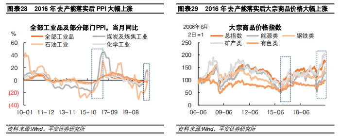 碳中和政策实施期间,可能出现类似于2016年供给侧结构性改革期间的通胀压力。这类通胀压力可能源于:1)传统能源使用成本上升,并向下游传导较多,或2)新能源与传统能源青黄不接,导致出现阶段性的“供给冲击”。而通胀是货币政策的核心目标之一,从而会给货币政策的应对带来挑战。低碳政策的供给冲击可以与2016-2017年供给侧结构性改革时期对标。2015年中央经济工作会议首提“三去一降一补”,并将其作为2016年中国经济发展的主要任务,其中“去产能”就是积极稳妥化解煤炭、钢铁高排放行业的产能过剩问题。2016年伴随“去产能”毅然落实,我国PPI大举回升,PPI同比从2015年底的-5.9%一直涨到2017年2月的峰值7.8%,其中,煤炭及炼焦工业、石油工业PPI涨幅最为明显,2016年全年涨幅分别达到61.6%和39.9%(图表28)。大宗商品价格从2016年初的低点开启一波大幅上涨(图表29)。