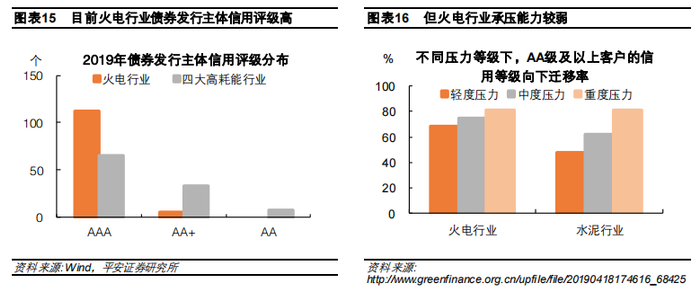 目前我国高碳行业信用等级尚且较高,但在低碳转型过程中或将承压。火电行业方面,2019年进行债券融资的火电企业有118家,发债主体均为央企及地方国企,主体信用级别为AAA的占比为95%;高耗能制造业方面,2019年化工原料、基本金属、贵金属、钢铁等高耗能行业的106个债券融资记录中,发行主体信用评级为AAA级占比为61%、AA+为31%,信用等级也比较高(图表15)。