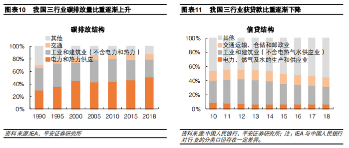 我国高碳行业的信贷获取已趋势性下降。根据IEA数据,我国碳排放结构趋于集中,2018年的碳排放中有89%来自工业和交通业,其中电力热力行业占据半壁江山(达51.4%),比1990年高出21个百分点(图表10)。而在我国的贷款结构中,工业和交通业贷款获得量占比趋于下行,2018年这一比重为43.4%,其中电热水行业总计占比仅为7.2%(图表11)。