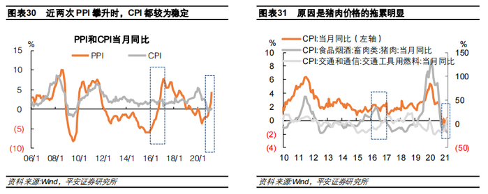 上轮供给侧结构性改革时期,我国PPI虽大幅提高,但CPI保持平稳,始终在1.3-2.3%之间波动,与2021年以来的情况相似。这两次CPI的平稳都主要得益于猪周期行至下半场,权重项猪肉价格同比大幅下滑,帮助平抑了CPI波动。当然,中国经济本身没有过热,货币供应得到合理控制,也是重要原因(图表31)。