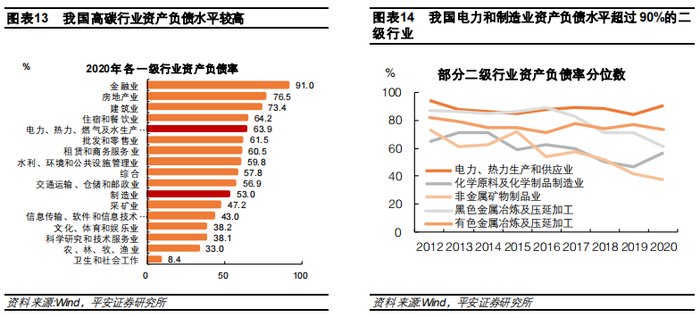 高碳行业高杠杆运行的特征容易在低碳转型过程中带来金融风险。碳排放占比最大、并持续上升的电力行业首当其冲。电力行业具有重资产属性,资产负债率较高。根据Wind数据,2019年,我国上市火电企业的总负债为16310亿元,资产负债率达到65.1%,虽已较2012年下降超过10个百分点,但仍处于较高水平。截至2019年末,火电企业流动负债占总负债比重为56.1%,流动比率0.58倍,显著低于2倍的一般标准,存在一定短期流动性风险(图表12)。