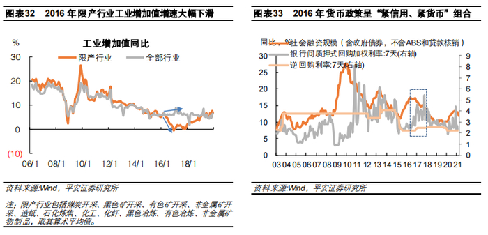 如果在碳中和过程中转型风险暴露,导致高碳排放部门的资产价格显著下跌,则可能冲击相关产业链的产出增长,形成经济增长的结构分化,这会给评估货币政策立场带来难度。这一点2016年供给侧结构性改革期间同样提供了参照。以工业增加值当月同比表示产业增长情况,在改革之前的10年左右时间内,供给侧改革所要求限产的行业均与全部行业的增长保持一致趋势。但是从2016下半年开始,限产行业的产出同比出现大幅下滑,而全部行业的产出同比保持平稳,也就是说非限产行业增长是向好的(图表32)。这种经济增长的结构分化一直持续到2017年底。当时,货币政策正常进入“紧信用”过程,并伴随金融监管风暴而呈现“紧货币”格局(图表33)。也就是说,在上一轮供给冲击导致经济增长结构分化时,货币政策对受冲击行业的“关照”相对较少(这本就是去产能政策初衷所在),而更多作为总量政策发挥宏观调控作用。