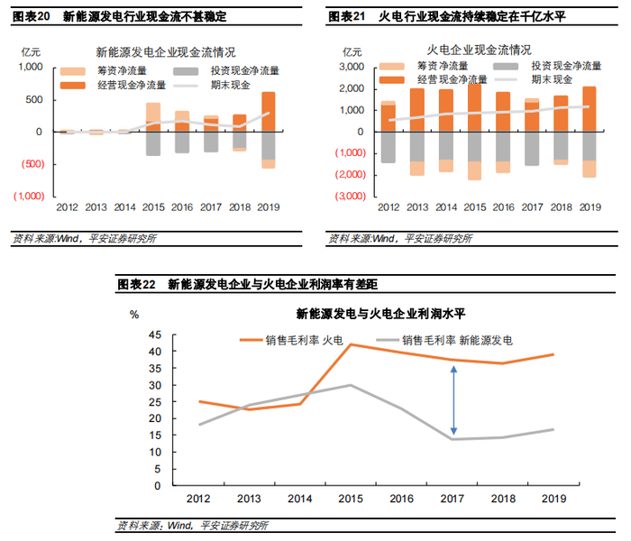 但值得思考的是,如果绿色信贷不良率低、银行绿色资产风险小,那么商业银行应该有更大的主动性为绿色项目发放贷款,为何还需要依靠“降低绿色资产风险权重”给银行提供激励?一方面,由于目前绿色项目有“国家队”在带头推进,国字头企业有政府背书,同时还有产业政策助力,因此投向绿色领域的贷款信用水平更好;另一方面,我们不能仅看当前的不良率指标,从现金流来看,新能源发电企业的现金流(尤其是经营现金流)波动较大,而火电企业的现金流则基本稳定(图表20、图表21);从利润指标来看,2015年新能源发电企业毛利率近30%,但是2017-2019年减少了近一半,而火电企业近五年利润水平稳定在35-40%水平,稳定性和营利性均好于新能源企业(图表22)。因此,相较于高碳行业,绿色行业未必是银行的偏好所在,更需要货币政策给予激励。