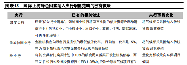 根据“丁伯根法则”,央行若将有限工具用于应对气候变化,就可能难以保障通胀等货币政策基本目标的实现。因此,货币政策操作是否应该考虑绿色金融问题,目前各国仍存争议。但是普遍形成共识的是,绿色金融可以纳入到央行的职能体系中,通过完善宏观审慎评估体系(MPA),加强对绿色金融的支持力度。从全球各国的实践来看,将绿色因素纳入货币政策考量、进而对央行职能进行扩充的方式主要有4类,按央行职能“扩充幅度”的大小依次为:1)将气候相关风险纳入传统货币政策框架,如印度和孟加拉国央行等;2)量化宽松政策向环保项目倾斜,如欧央行;3)将绿色因素纳入金融监管范畴,如巴西央行;4)在宏观审慎管理方面加入气候变化带来的金融风险,如中国人民银行和黎巴嫩央行等(图表18)。