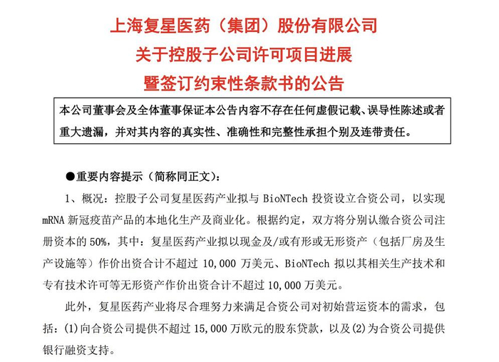 5月9日晚,复星医药发布公告,称控股子公司复星医药产业拟与BioNTech投资设立合资公司,以实现mRNA新冠疫苗产品的本地化生产及商业化。