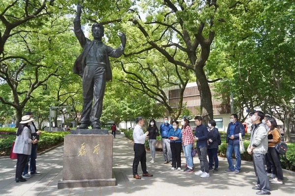 新民晚报讯 (记者 袁玮)《义勇军进行曲》是中华人民共和国国歌,它诞生在1935年,和徐汇区有着密不可分的关系。这首战歌是怎样诞生的,它的历史背景是怎样的,它是由哪些伟大的革命者、艺术家共同参与完成的?日前,徐汇区委党校教职工通过重走独一无二的“国歌诞生路线”,开展了一场行走中的党课,这场党课对这些问题作了解答。大家通过走访田汉旧居、聂耳铜像纪念广场、夏衍旧居、百代小楼等地,追寻先贤们的足迹,一同走进国歌在徐汇诞生的光辉岁月和引人入胜故事情节,感悟中国共产党带领中国人民对伟大民族精神不懈追寻的红色历史。