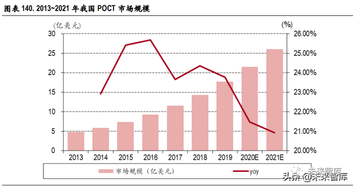 2016 年我国 POCT 市场规模仅为 61.75 亿元,根据 TriMark 预测,2018 年我国 POCT 产业市场规模为 14.3 亿美元,此后几年将维持 22%的年复合增速,预计 2021 年市场规模达到 26 亿美元。。由于我国人口 基数大,老龄化现象严重,医疗资源地区发展不均衡,中国必将是 POCT 潜在的发展市场。随着我 国分级诊断政策落实和医疗改革体制的推进,以及居民健康管理意识的不断提高,未来几年我国 POCT 行业仍将保持较快速度的增长。