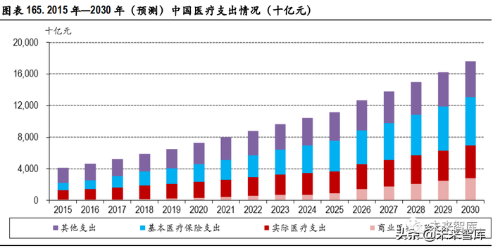 据沙利文数据分析显示,我国医疗费用由 2015 年的约 40975 亿元增加到 2019 年的 65196 亿元,年均 复合增长增长率为 12.3%,预计到 2024 年将进一步增长至 106204 亿元,复合年增长率为 10.3%。预计 到 2030 年将增至 176157 亿元,2024 年至 2030 年的复合年增长率为 8.8%。2019 年,中国卫生总支出 排名世界第二。