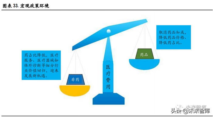 从生物医药宏观政策环境来看,医保控费一直是近年主旋律。医保控费的核心在于提升医疗设备及 药品的使用效率和取消药品加成,就这一点来看,体外诊断行业的发展与应用,有助于优化医疗资 源的配置,提高使用效率,所以医保控费对体外诊断行业来说起正向推动作用。另外,取消药品加 成医院药房从之前的盈利部门转变为成本部门,出于整体收入方面考量,医院也有极大可能在未来 将更多注意力投入到医疗服务和诊断科室,以弥补其在药品方面收入的损失。