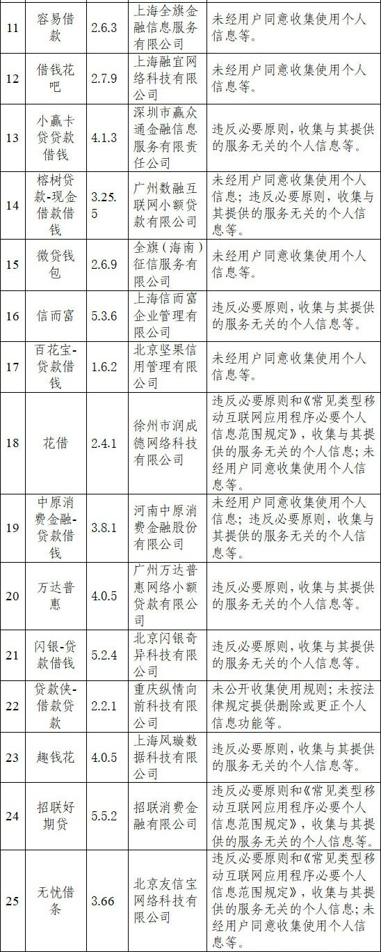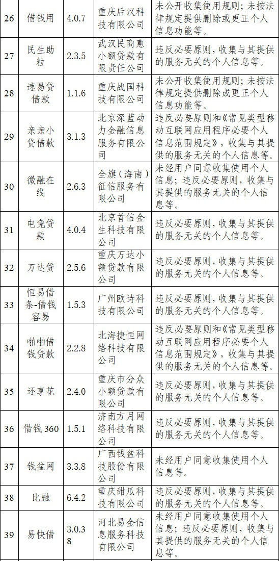 鑫涌算力信息科技(上海)有限公司运营的借点钱贷款、徐州市润成德网络科技有限公司运营的花借等App违规问题较多。