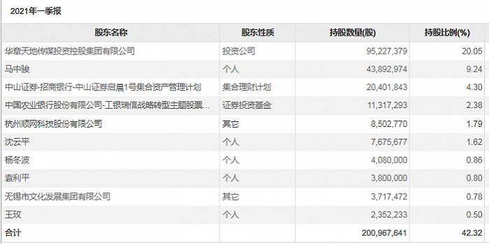 尽管从2015年9月开始,慈文传媒已经摆脱了无实际控制人的局面。但截至目前,该公司股东持股情况仍非常分散。2021年一季报显示,其第一大股东是持股比例为20.05%的华章天地传媒投资控股集团有限公司(下称华章投资),第二大股东是原实际控制人马中骏持股9.24%,此外十大股东中有4位持股比例低于1%。目前,华章投资、马中骏为一致行动人,公司实际控制人为江西省人民政府。