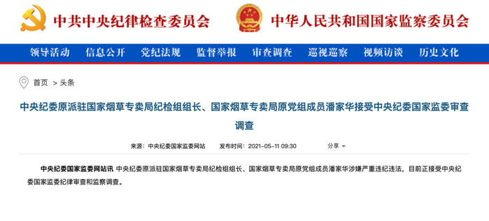 继昨日宣布江西省政协副主席肖毅落马后,今日严惩“灯下黑”,宣布中纪委驻国家烟草专卖局原纪检组长潘家华被查。