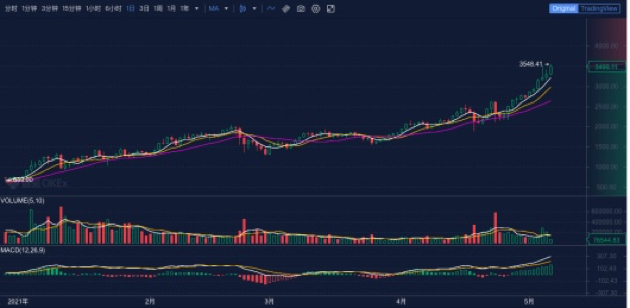 近期,以太坊也值得一提。5月10日,以太坊突破4000美元,价格创下历史新高。如果说狗狗币还是“屌丝币”,那么以太坊就不一样了。以太坊从一出道就被认为是仅次于比特币的二号选手,如今则大有叫板大哥的架势。