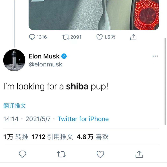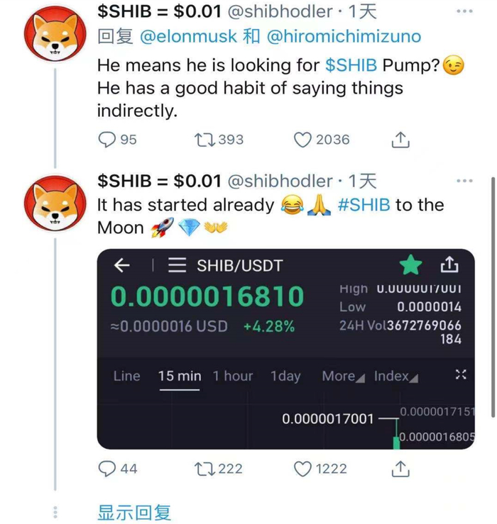 不同于通缩属性的比特币,柴犬币发行了1000万亿枚,虽然其中不少已经被他们送给V神,也有不少作废了,但流通在市场上的,依然有足足394万亿枚。捧红柴犬币的又是马斯克本人——前两天,马斯克表示他要养一只shiba(柴犬)作为宠物。