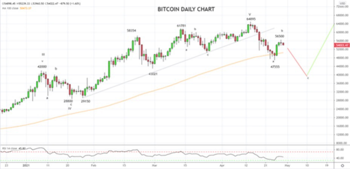 “我们可以合理期待在盘整期比特币将与以太坊共享市场焦点一段时间。考虑到这点,我们认为,比特币从2020年3月低点开始,于4月14日在64895高点完成了5浪主动反弹行情。64895高点到上个周末47555低点的下滑被视为三浪‘ABC’修正行情。隔夜浪B反弹止步于3月底和4月初日图低点密集的阻力带,形成了暗示动能丧失的十字星K线形态。展望后市,比特币可能展开新的跌势(C浪),下探40000支撑位,在那里我们观察筑底信号择机买入,期待重拾升势。”嘉盛集团资深分析师Tony Sycamore称。