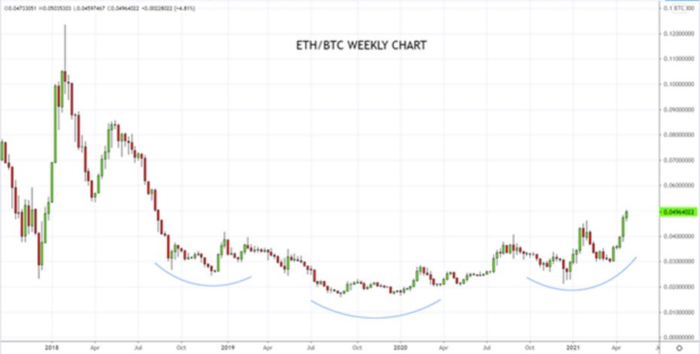 继2021年一季度强力反弹后,比特币4月中旬以来下挫27.5%,而以太坊同步反弹15%左右,以太坊与比特币的比值正不断抬升,交易员的关注重点因此转向以太坊。