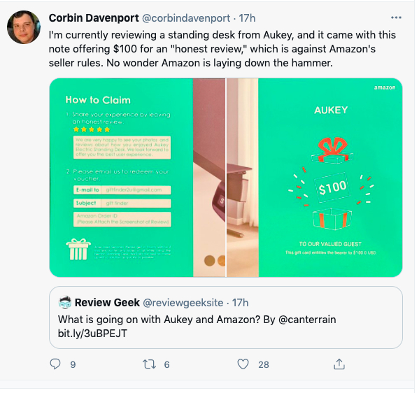 推特用户Corbin Davenport发现,自己收到的傲基产品中还附带着一张小卡片,只要在亚马逊上写下评论,他就可以获得100美元。“这违法了亚马逊的卖家规则,难怪亚马逊会落下大棒。”Corbin Davenport说。