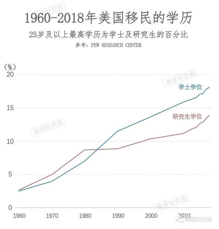 美国的移民教育水平一直稳定增长,但来自墨西哥及中美州的移民学历增幅不大,大多亚欧移民的生育意愿则和受教育程度近乎呈反比