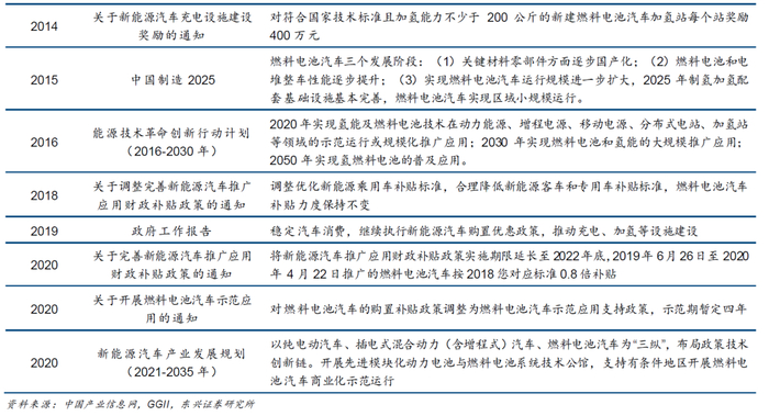 中国同样将燃料电池汽车作为新能源汽车的重要发展方向。《能源技术革命创新行动计划(2016-2030年)》、《中国制造2025》等国家级规划都明确了氢能与燃料电池产业的战略性地位,将氢燃料电池汽车列为重点支持领域。2020年10月《新能源汽车产业发展规划(2021-2035年)》提到,以纯电动汽车、插电式混合动力(含增程式)汽车、燃料电池汽车为“三纵”,布局政策技术创新链。开展先进模块化动力电池与燃料电池系统技术公关,支持有条件地区开展燃料电池汽车商业化示范运行。