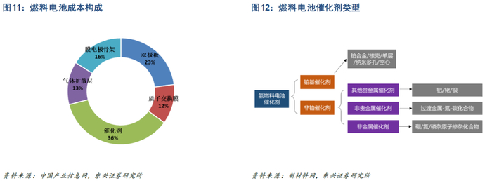 燃料电池主要由膜电极(MEA)、双极板和其他组件构成,其中膜电极是核心组件,包括气体扩散层、催化剂、离子交换膜等。燃料电池催化剂起到降低电极反应活化能、提高反应速率的作用,是燃料电池的关键材料和运行保障。同时,催化剂也是燃料电池的主要成本项,根据中国产业信息网,2019年催化剂在燃料电池成本占比高达36%,在所有材料中居首位。