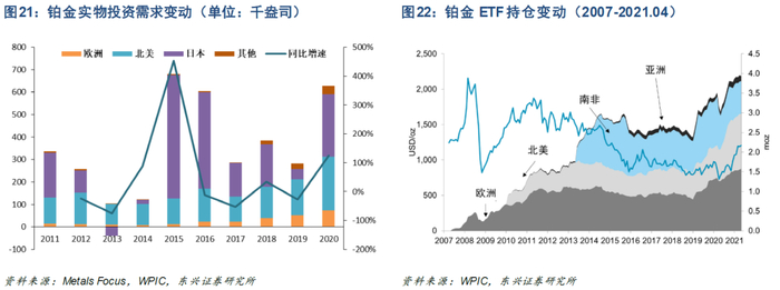 实物投资需求走旺,日本市场贡献主要增量。2020年,全球铂金条和金币的零售投资同比大增119%至62.9万盎司(19.6吨),成为仅次于2015年的历史最高水平。分地区观察,欧美日市场均呈现出40%以上增幅的强劲势头,日本市场的增幅更是达到了509%。2020Q1铂价暴跌和对黄金折价的急剧扩大,使得投资者逢低买入,推动实物需求飙升。