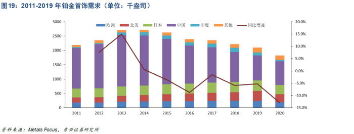 铂金首饰需求或持续复苏,2021有望实现7年来首次年度增长。中国和欧美市场铂金首饰零售业务自20Q2先后实现强劲复苏,令全年铂金首饰消费降幅收窄至-13%(降至56.8吨)。2021年,考虑到婚庆活动的恢复以及中国渠道商或加大市场营销力度,我们认为2021年铂金首饰需求有望恢复至2019年水平附近(64.2吨,同比+13%),实现2013年以来的首次年度增长。