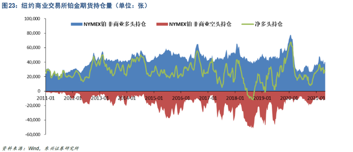 铂金期货持仓呈现多头格局,显示投资者对铂金信心依旧。2019年中开始,投资者对铂金的信心显著复苏,2020年初NYMEX铂非商业净多头仓位攀升至历史新高。尽管全年大部分时间多头持仓有所下滑,但整体仍保持净多头格局,全年平均非商业净多持仓维持在25543张。