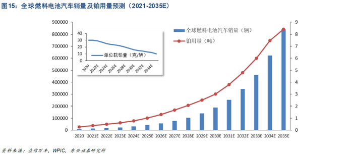 尽管当前全球氢燃料电池车数量有限,但若按前文所述,假设2035年全球燃料电池车保有量能达到300万辆,而技术进步推动每辆载铂降至当前1/3(10克),则2021-2035年期间合计铂金需求量将达到44吨,2035年燃料电池载铂用量达到8.4吨。