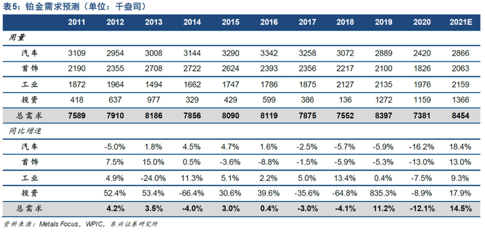 2020年,全球工业部门铂金需求量下降7.5%至197.6万盎司(约61.5吨)。疫情对化工/石油/电子行业冲击明显,其铂金需求同比下降15%/47%/11%,与之形成对比的是玻璃行业需求实现V型复苏,同比增长65%至12.6吨,一定程度上抵消了其他行业的需求下降。2021年,考虑到LCD现有产线的产能扩充、玻纤需求的持续旺盛、以及全球炼化产能的恢复和提升,我们预计2021年工业领域铂金需求同比增长9.3%至215.9万盎司(67.1吨)。