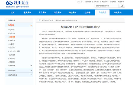 5月11日晚间,兴业银行官网发布公告称,该行于当日召开中层正职以上干部大会,宣布福建省关于兴业银行主要领导任职的决定。经省委研究决定,吕家进担任兴业银行党委书记,下一步将出任兴业银行董事长。