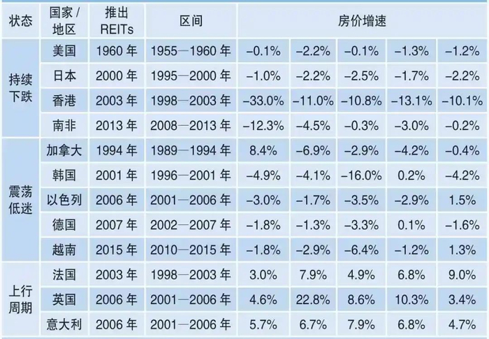 一是城镇化中后期的房地产成长性转弱,REITs促进了房地产行业的发展模式转变。在城镇化初期,房地产行业发展快速,简单的“开发-销售”即可获得高回报;在城镇化中后期,房地产成长性转弱,“开发-销售”收益走低,深耕“运营”更能获得稳定回报,这是REITs助推房地产行业转型发展的核心逻辑。在全球范围内,除了法、英、意等少数国家外,大多是在房地产高速增长后、行业陷入低迷时推出REITs(见表1),借此改变颓势。比如,在推出REITs前,美国、日本、香港、南非等国家或地区连续5年房价负增长,在推出REITs后房市均有不同程度改观。