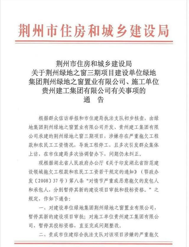 在这种背景下,财政吃紧的绿地集团难以避免地陷入拖欠施工单位工程款项的问题中,从去年底开始,就有哈尔滨、长沙以及荆州分别曝出绿地拖欠农民工工资的事情,为此荆州市住建局还专门发出过停工通告。