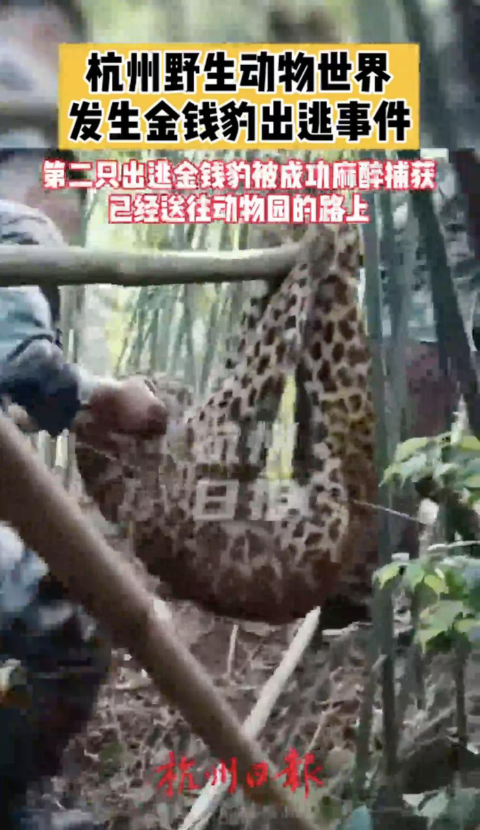 5月8日,据微博@富阳发布称,16时50分许在富阳金苑山庄小区附近山林发现并成功麻醉捕获一只从杭州野生动物世界逃脱的未成年金钱豹。