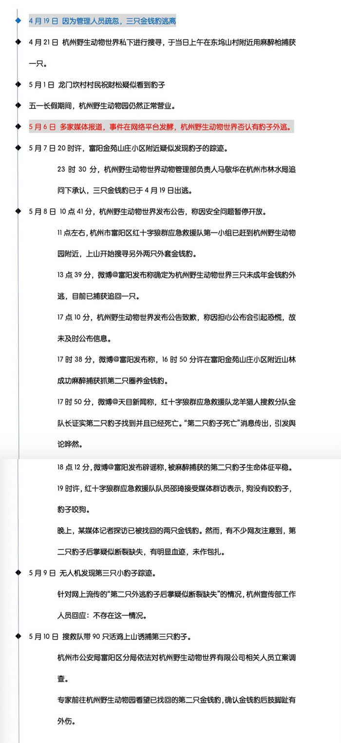 5月10日,杭州通报“金钱豹外逃事件”调查进展,称5月7日23时30分,杭州野生动物世界动物管理部负责人马敬华交代,因管理人员疏忽,
