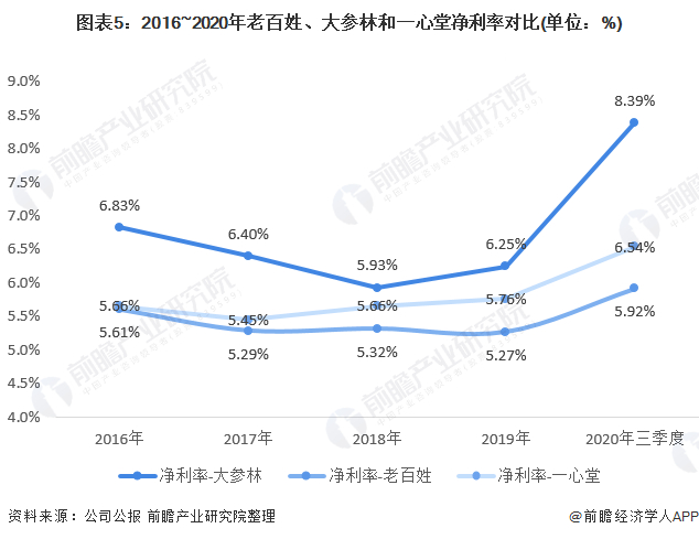 从营收增速来看,老百姓药房、大参林和一心堂药业三家公司的四年复合营收增速分别为23.3%、23.5%和19.3%;大参林的营收复合增速较快,且自2019年有进一步加速的趋势,到了2020年前三季度,大参林的营业收入为104.92亿元,营业收入比其余两家公司高。