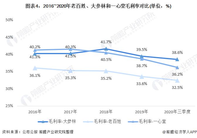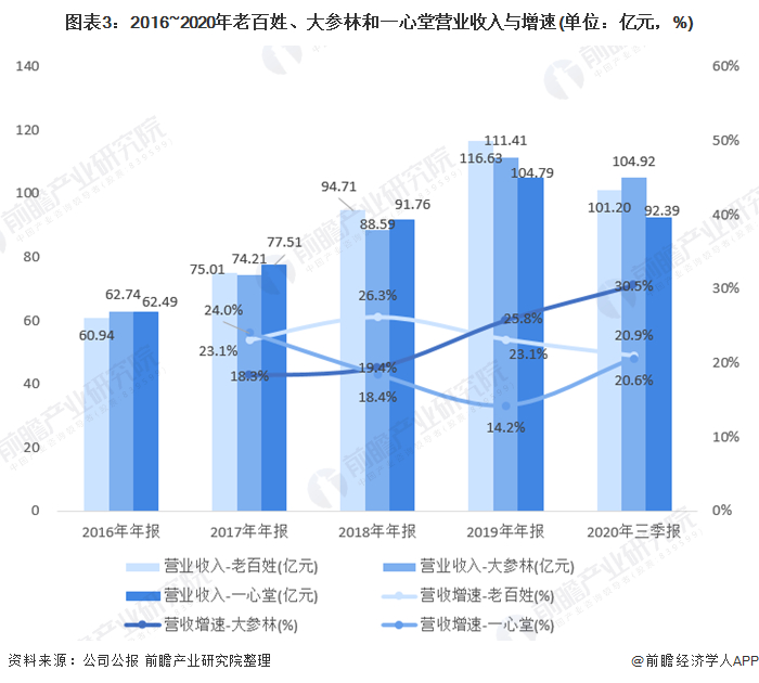 接下来选取上市企业中综合实力TOP3的连锁药店大参林医药、老百姓药房和一心堂药业进行对比分析。