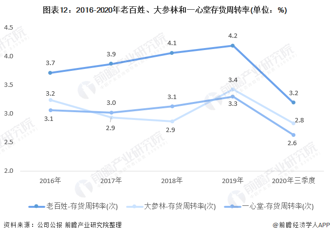 2020年三季度,三家企业的存货周转率都急速下降,其中老百姓药房的存货周转率为3.2,大参林和一心堂的存货周转率分别为2.8和2.6。