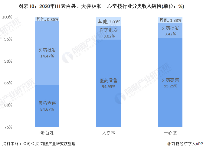 按行业分类来看三家企业的收入结构,可以看到大参林和一心堂两家公司约95%的收入都来自医药零售,仅有约3%的收入来自医药批发。老百姓药房有约84.7%的收入来自医药零售,14.5%的收入来自医药批发。